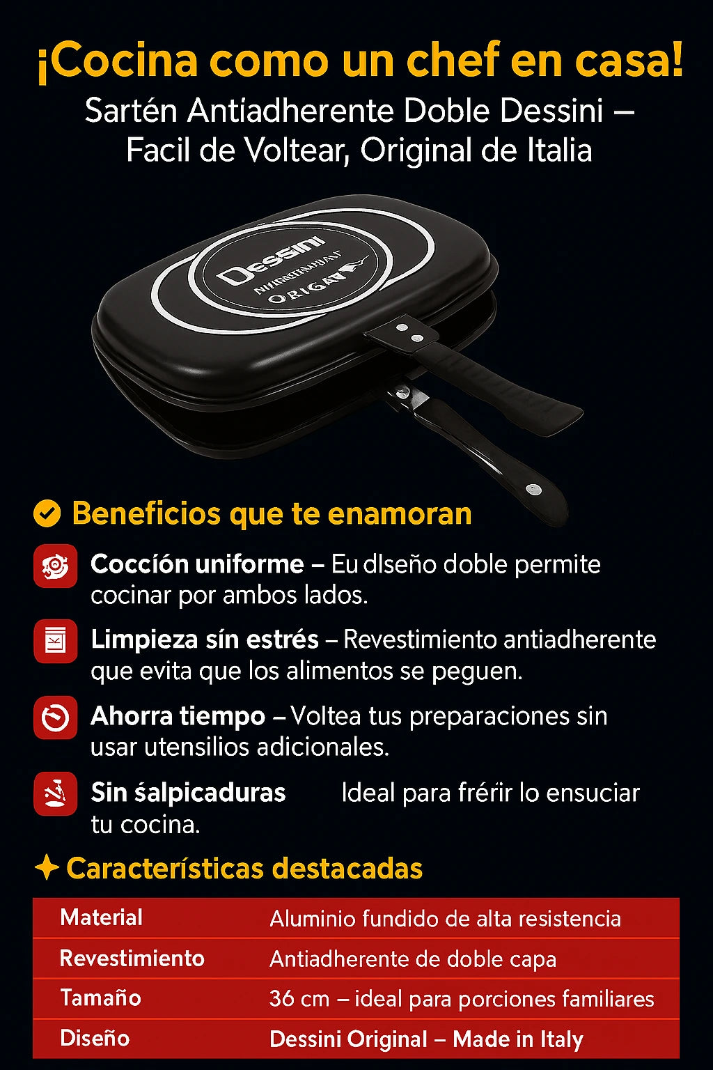 - Hecho con los mejores materiales del mercado para que tu comida quede bien cocinada, sin perdidas de sazón y que con el tiempo no se va a escarapelar.